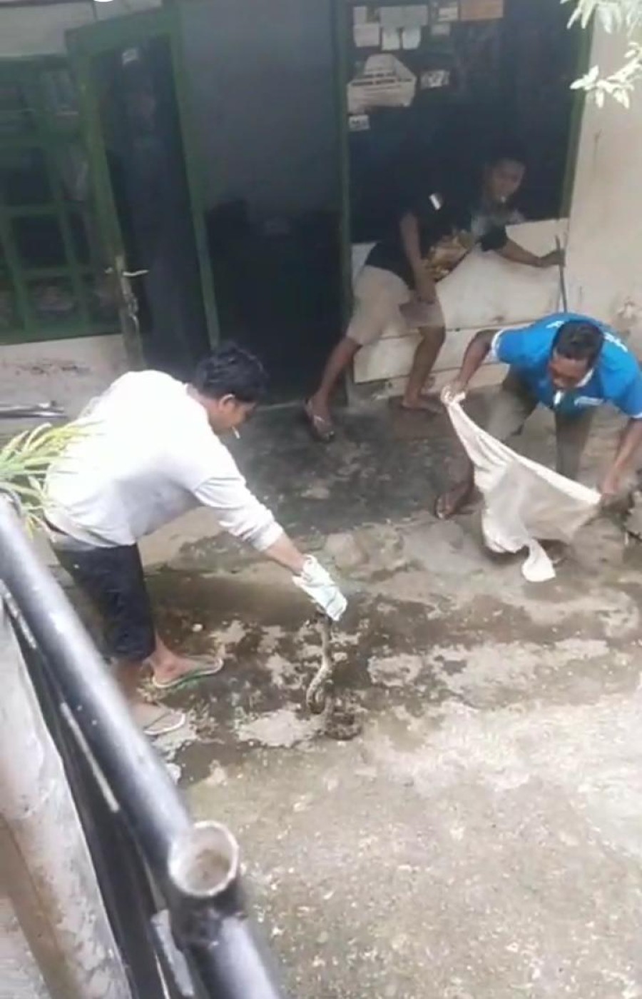 Mbok genuk yang pertama kali melihat ular di area langit tangit rumah yang belum di plafon mencoba mengusir dengan memberikan garam di area rumah pada hari sabtu 27 September namun ular tersebut tak kunjung pergi, hari sekanjutnya karena keluarga merasa tidak nyaman mbok genuk meminta bantuan untuk menguhubungi Damkar. Petugas membutuhkan waktu sekitar 10 menit untuk menjinakkan dan mengevakuasi ular yang bersembunyi di atap Ular sanca kembang sepanjang kurang lebih dua meter tersebut akhirnya berhasil dimasukkan ke dalam karung khusus. Rencananya, ular itu akan dilepasliarkan kembali ke habitat yang jauh dari permukiman warga. Warga diimbau untuk selalu menjaga kebersihan lingkungan dan menutup setiap celah di rumah untuk mencegah kejadian serupa.