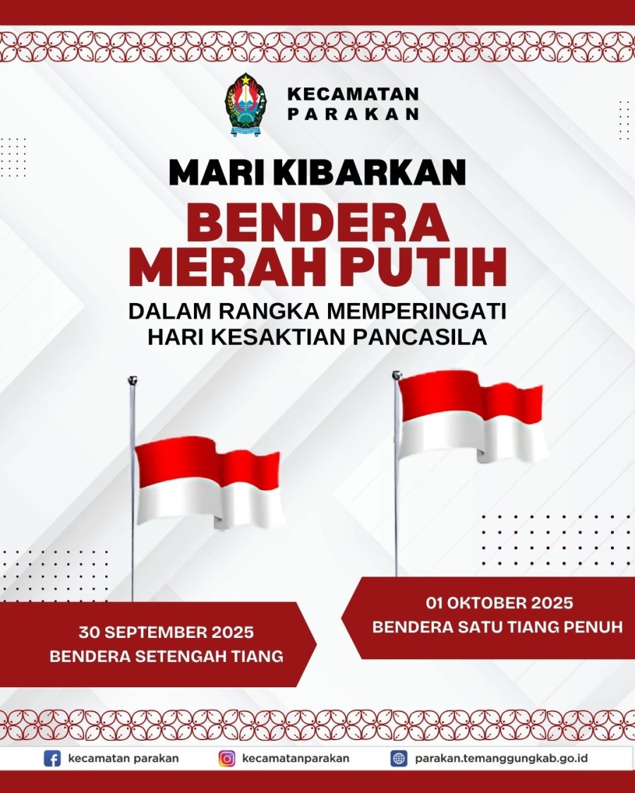 Mari Bersama-sama kibarkan Bendera Merah Putih Dalam Rangka memperingati Hari Kesaktian Pancasila dengan Bendera Setengah Tiang pada 30 September 2025, dan Bendera Satu Tiang Penuh pada 01 Oktober 2025.